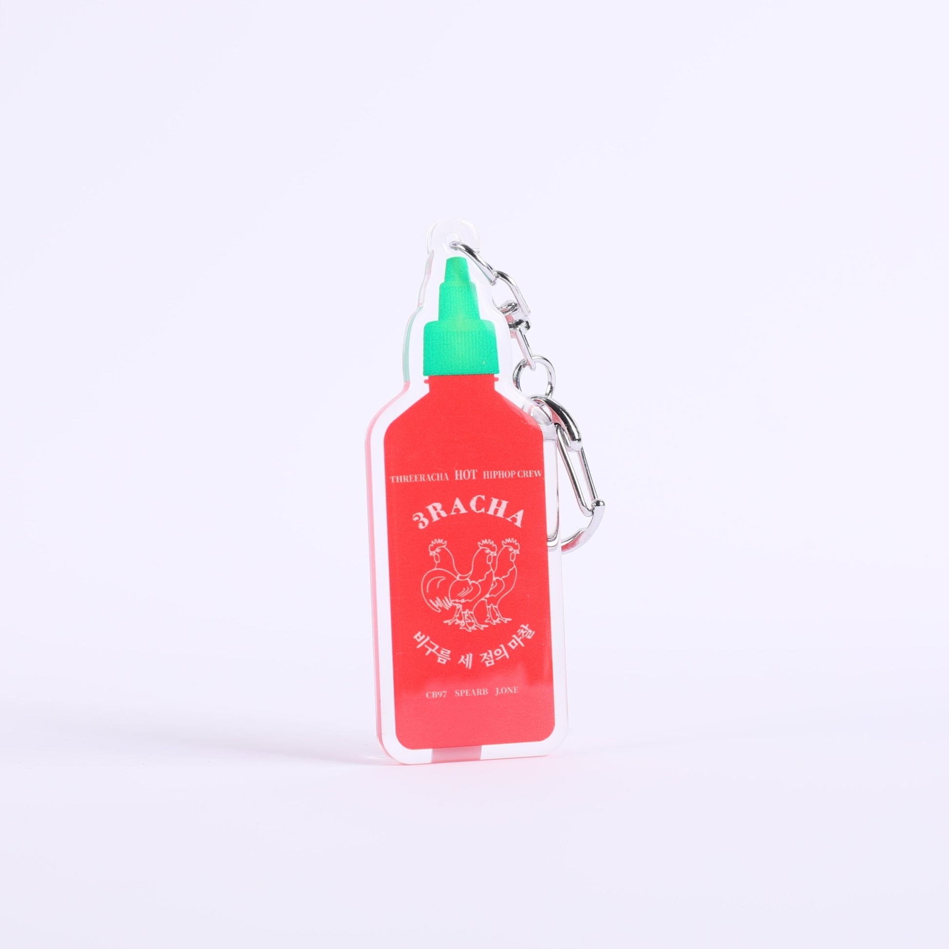Spice up your life with a little 3RACHA! This keychain design takes the classic hot sauce bottle and makes it even more iconic by adding elements of the hip hop trio's album cover and the lyrics '비구름 세 점의 마찰' from the unit song of the same name '3RACHA'.